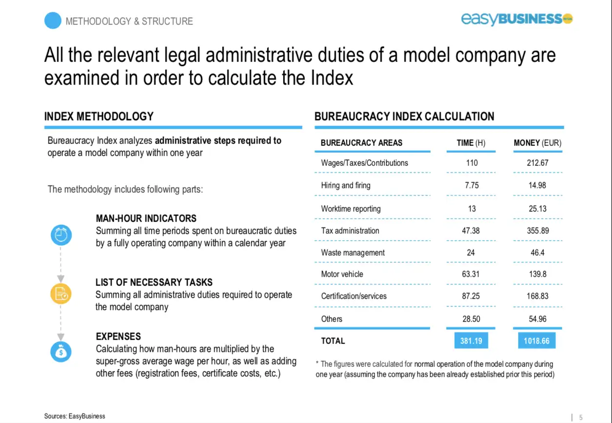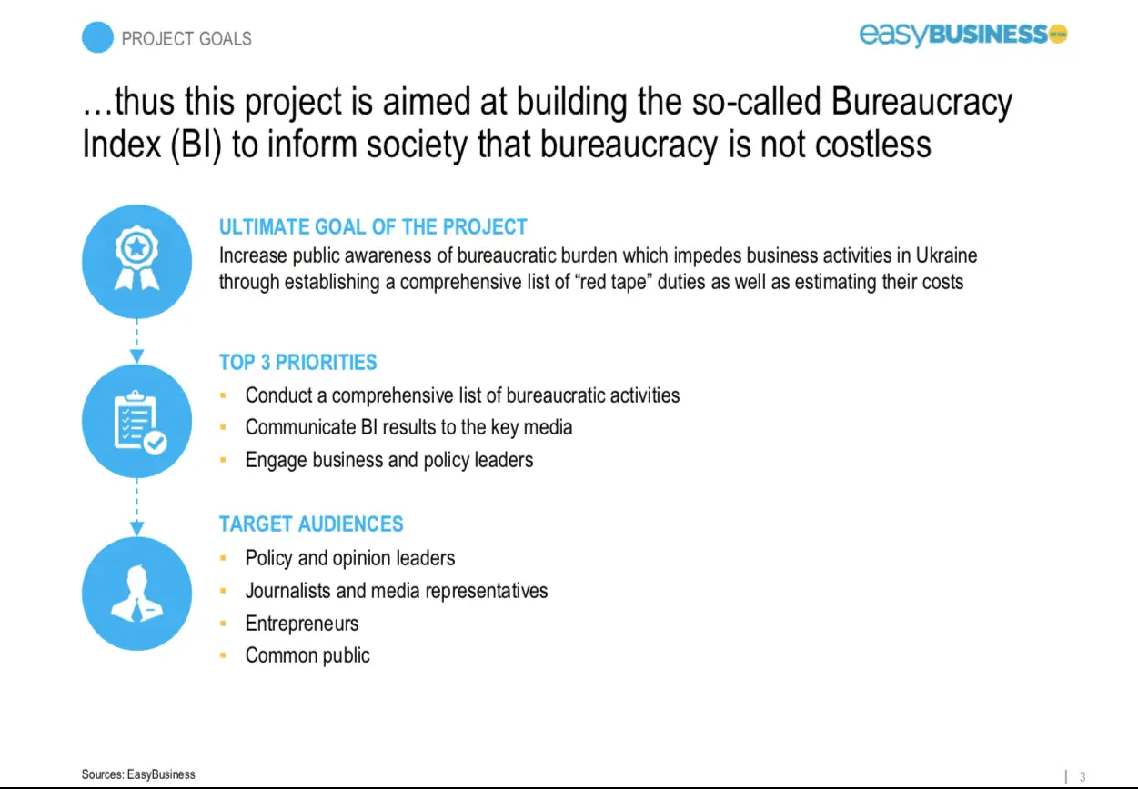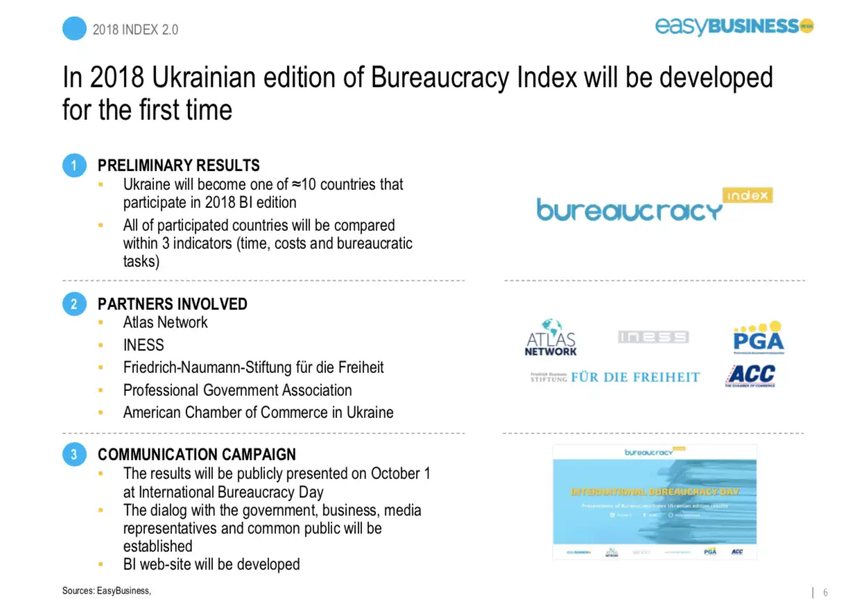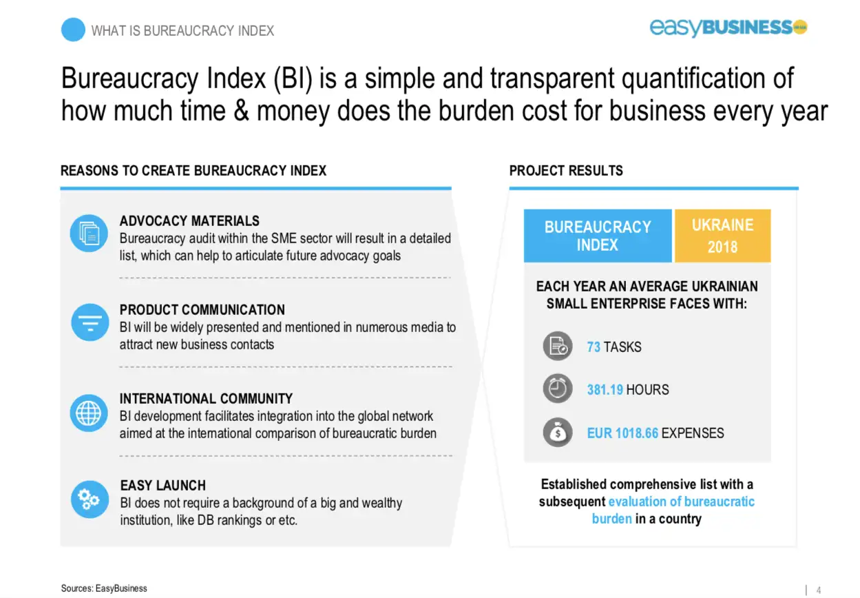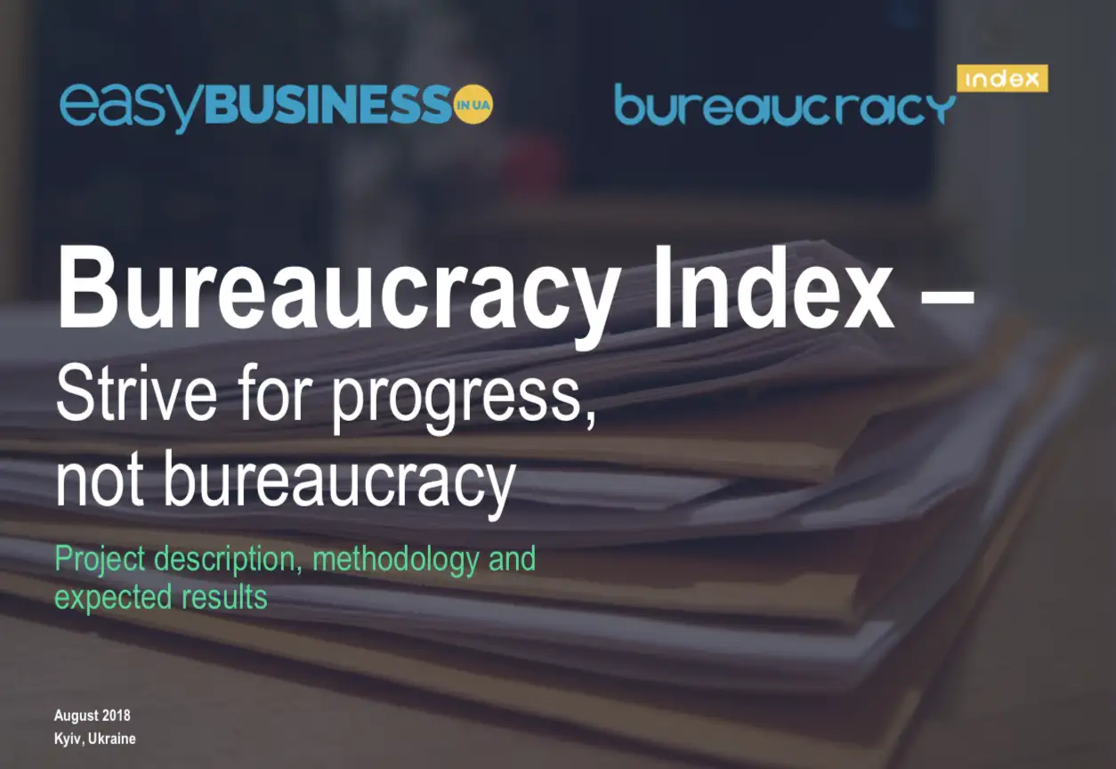 Індекс Бюрократії це прозорий і доволі простий інструмент, який вираховує бюрократію, базуючись на кількості процедур, годин, і витрат на бюрократію для підтриємств в Україні в поточному році.